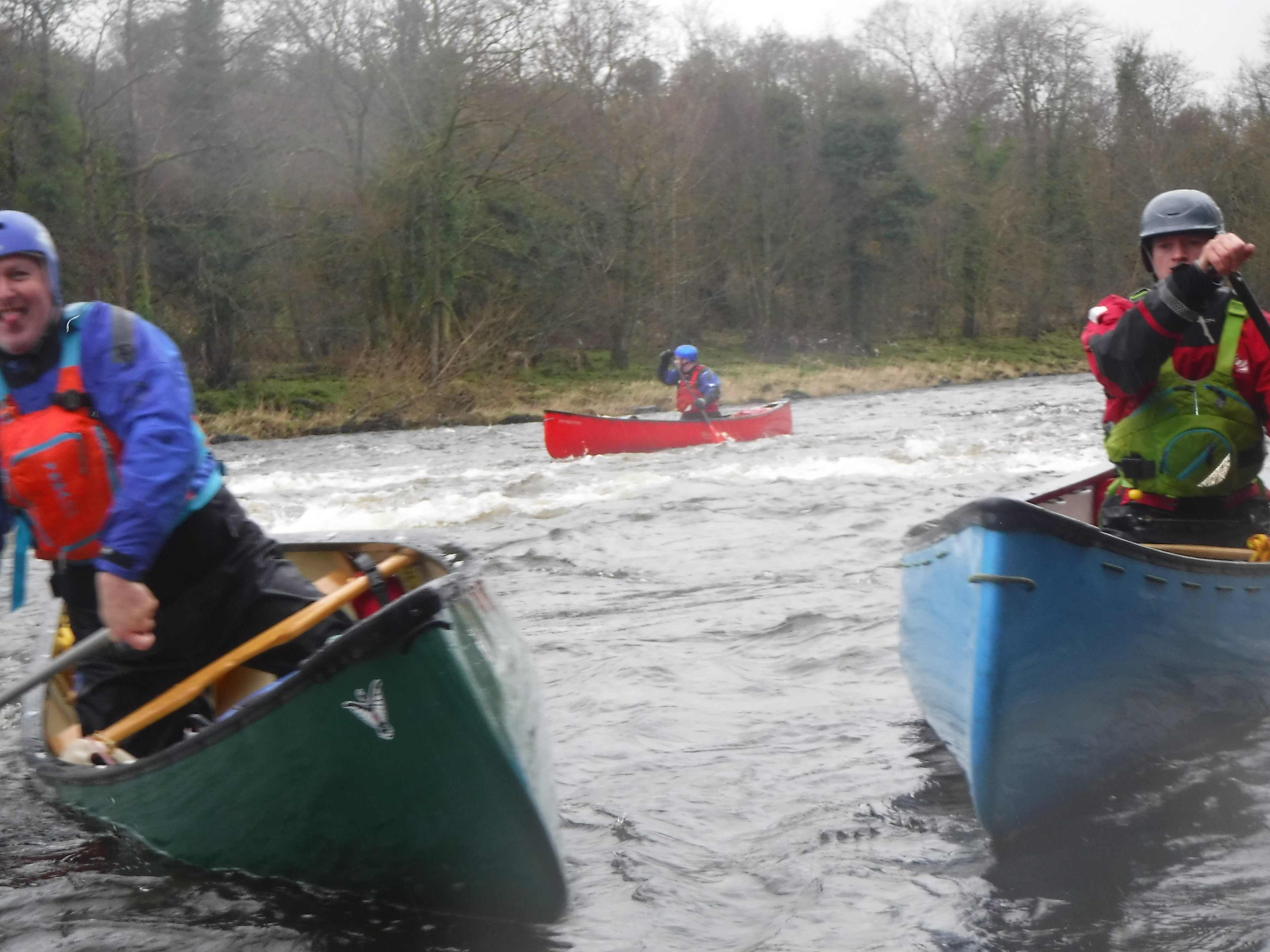 Day 3 of the CANI & Beaver Tooth Open Canoe skills training. The day started with a disappointing meeting at the get in on the Owenkillew River at Gortin. The river was very low and hopes for the day were going equally low. We regrouped in Newtownstewart and to our surprise the Mourne was running well, opening up the left side of the Fisheries rapid. The aim of the progressive award is to prepare paddlers to be independent paddlers in every sense of paddling at that level. For example, judgements, making decisions on those judgements, such decisions, while not group leadership ones do mean you are thinking for yourself and friends so you do need to be able to read weather, water, hazards and think ahead to what might be around the next corner. Overall this was a great days paddling. At the Fisheries rapid, which was going well, I got each paddler to ferry glide across the top of the very wide flat water before the excitement. As the flow was fast and the wind equally challenging, each person had to find their own level of comfort as to how close they would go to the drop, just in case they went somewhere they would much prefer someone else to go, if you know that feeling Lol.