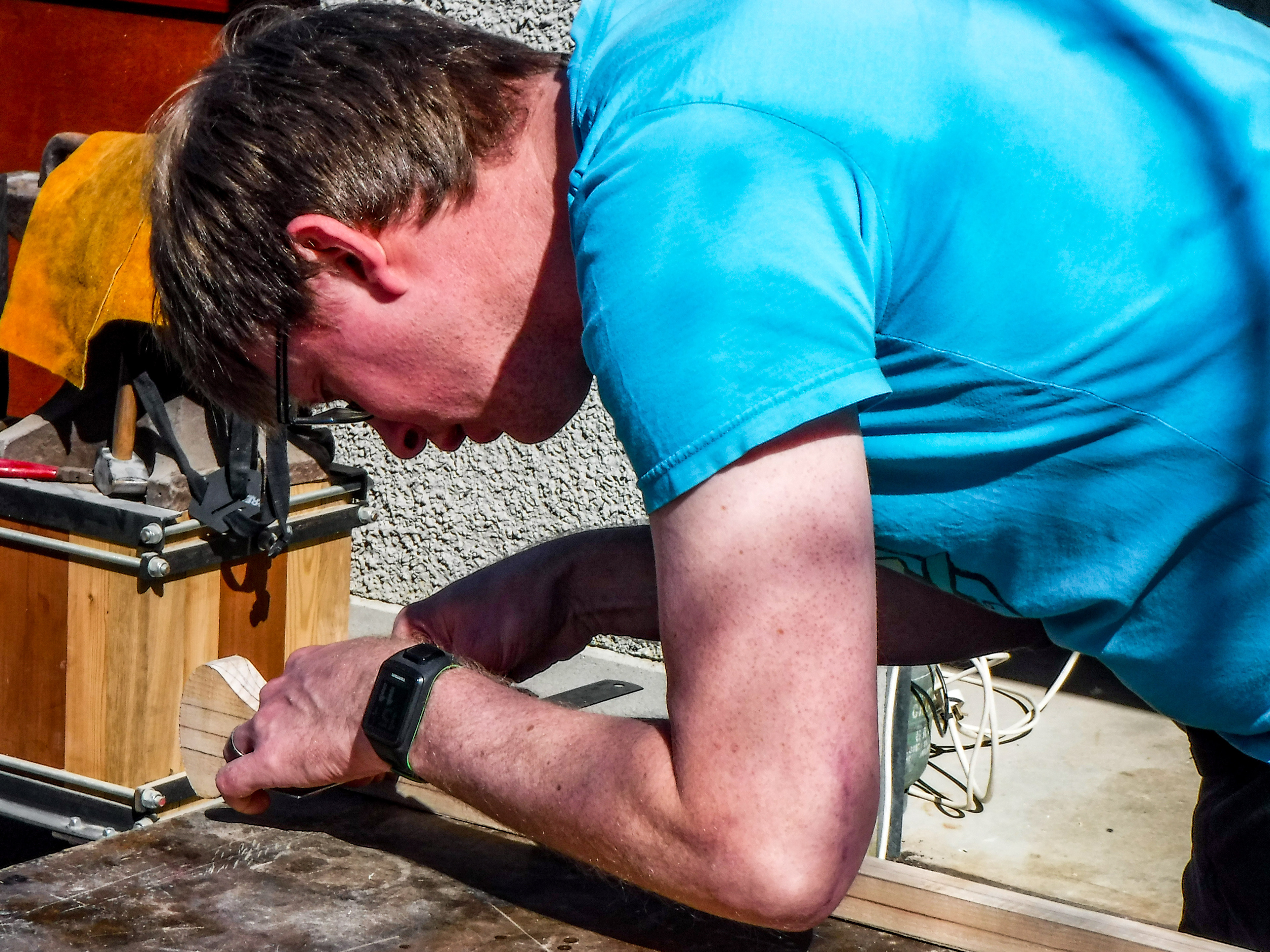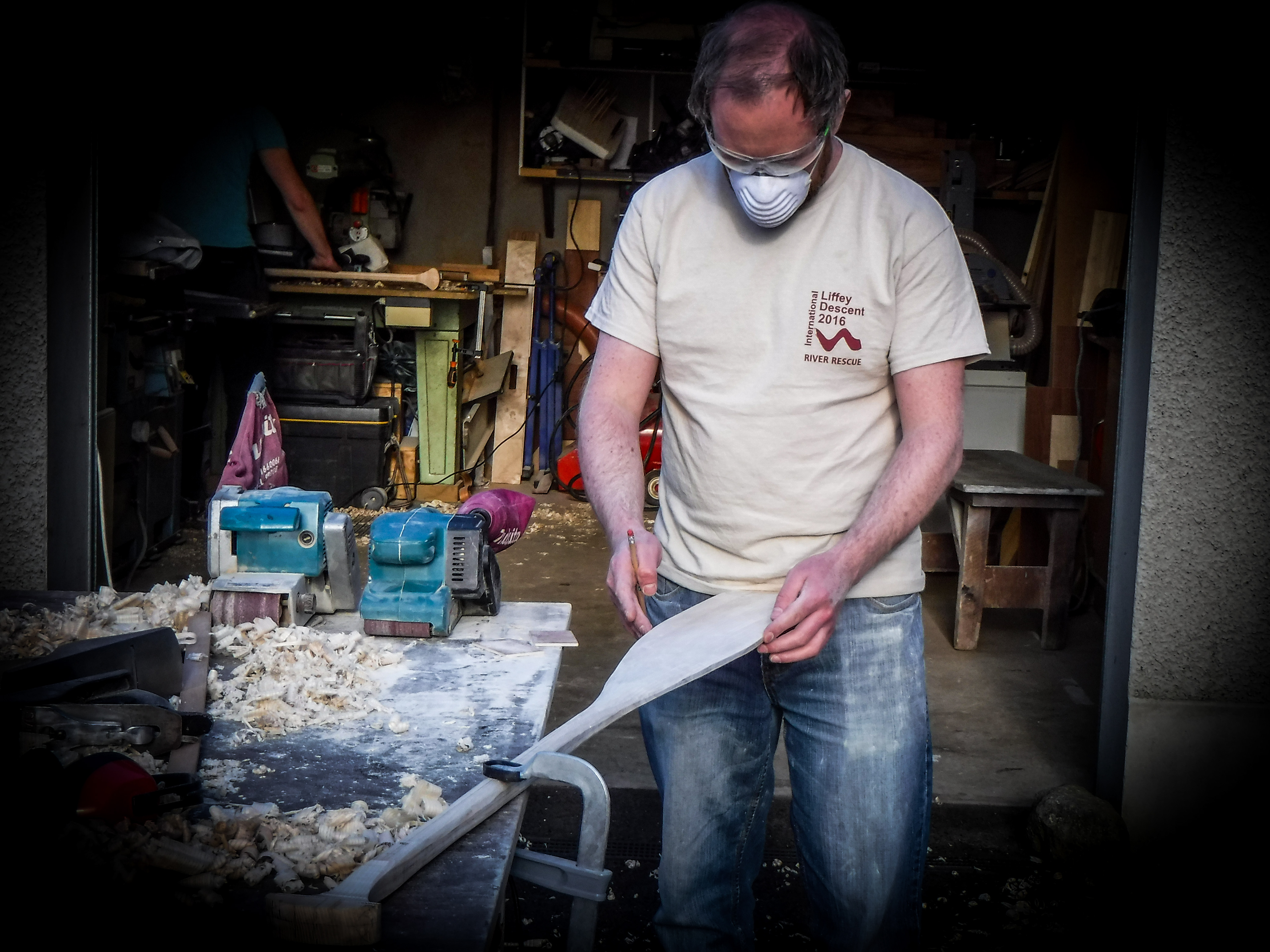 Up a creek with your own handmade paddle. Beaver Tooth ran a paddle making course for the Ulster Canoe Club. The team of 3 arrived on Saturday morning full of expectation, doubt, fear and hands ready to work. The course explored design, timber choice and the types of grain cut. The candidates picked their desired design from a list of 5, calculated it unto template card and after picking their wood, transferred the design to their wood. By the end of Saturday they had paddles of sorts. Sunday started with a mission, plus some of my wife's home baked lemon drizzle cake, and by late lunch time, 3 beautiful ash bespoke paddles appeared; one Algonquin and two Beavertail. To personalise then some individual pyrography design work was added. Three happy, tired paddlers went home with their completely finished paddle with just the oiling process to do at home; which take several days.