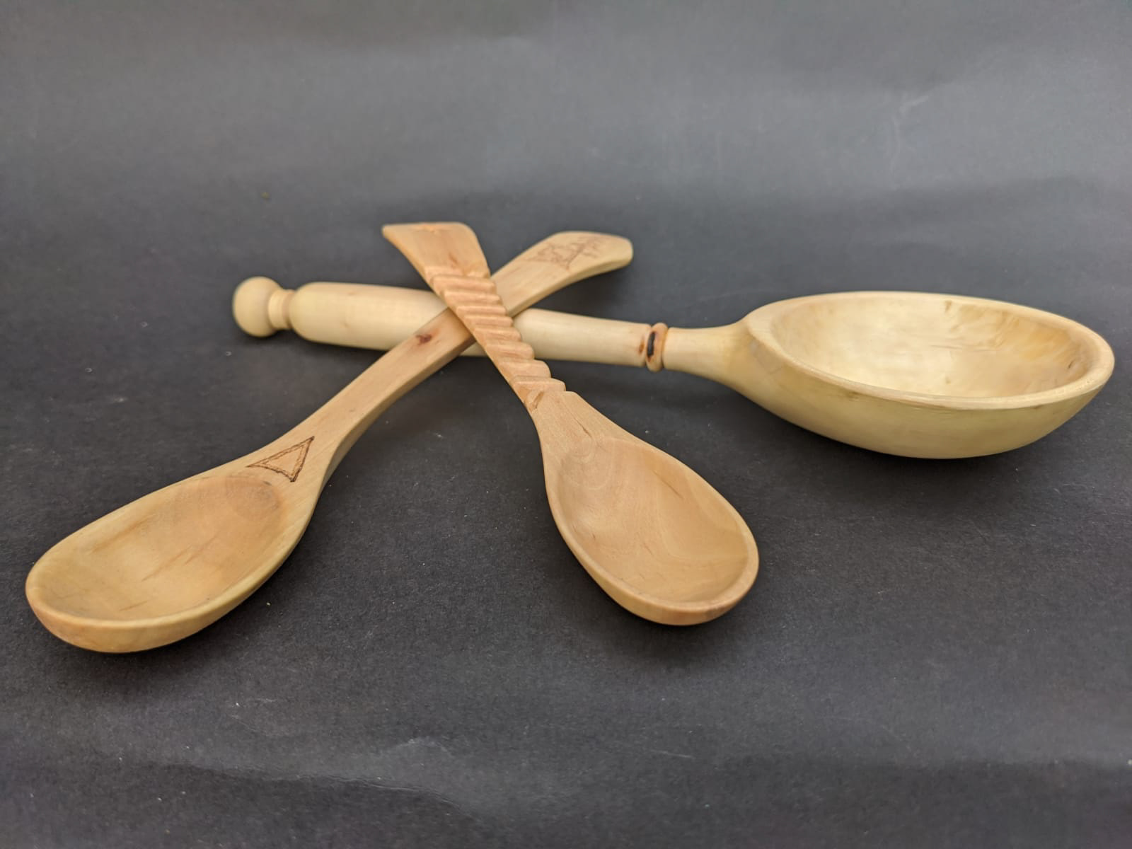 The top 3 spoons are carved from Hawthorn. Each demonstrates different techniques to add detail to the spoon. For example, the woodlathe, just using a knife to get the grooves on the stem and then using a pyrography pen to burn on a little picture of a deer standing under a tree. Click on a photo to get a larger version to see the detail.